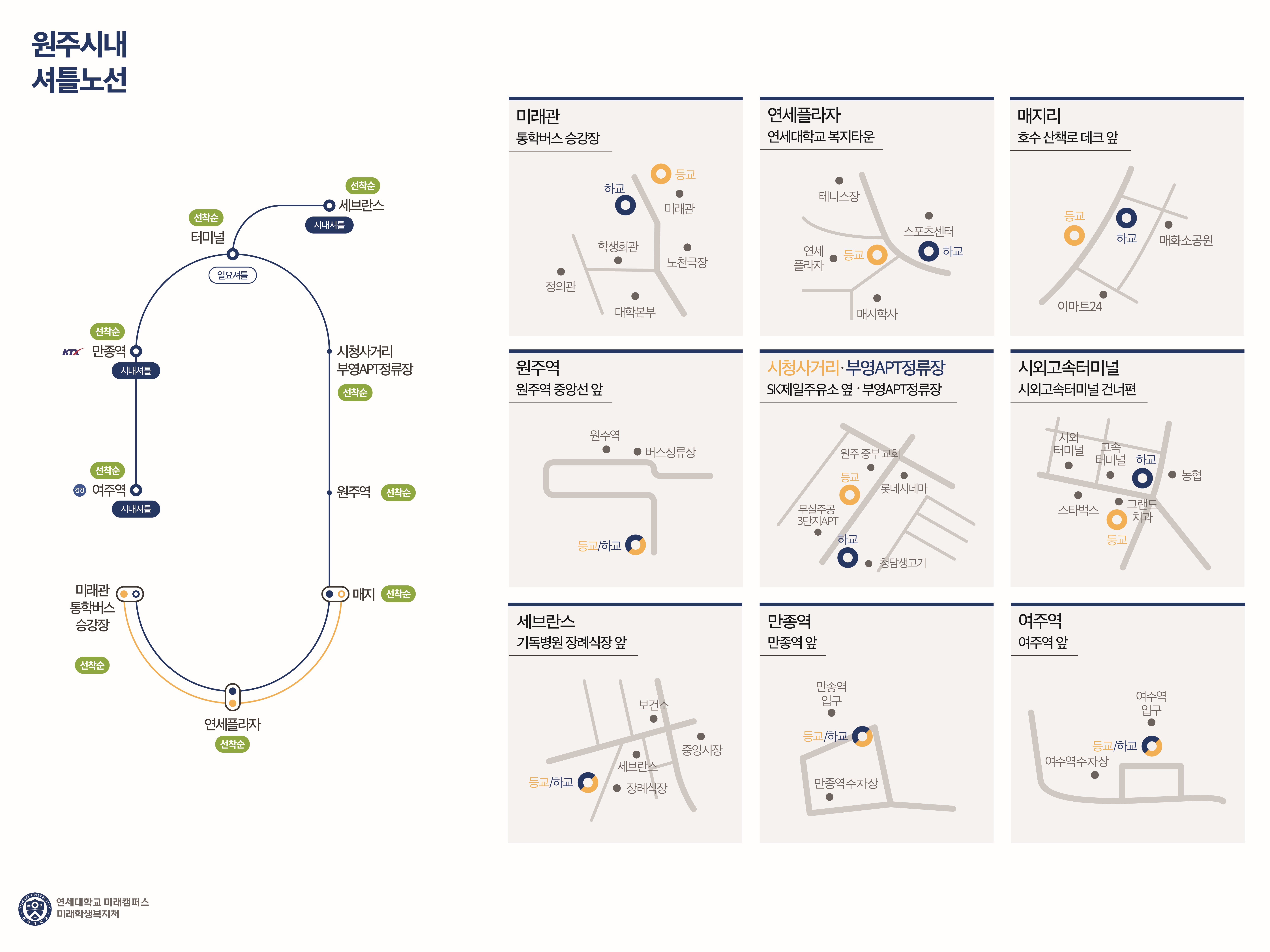 연세대학교 미래캠퍼스에서는 학생들의 편의를 위해 정기적으로 시내 및 학교 앞을 운행하는 셔틀버스를 운영하고 있습니다.